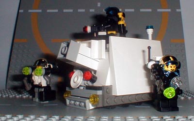 | 2000年一発目に購入したのが、サッカーレゴの救護班とTVクルー。 救護班に付いてた屋根2枚を縦にすると戦車のシュルツェン(サイドアーマー)に ならないかなーと思ったのがモデル制作のきっかけです。 ですから試作モデルはその2種を部品に使ったため、白色と青色で構成されていました。 サイドになんかマークが欲しい気も・・・ |