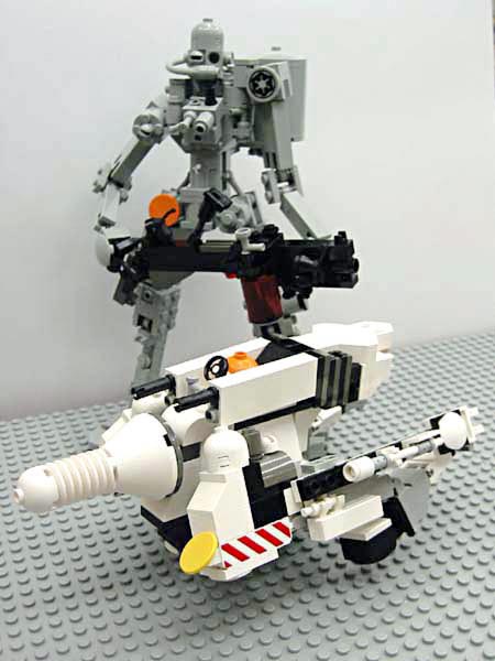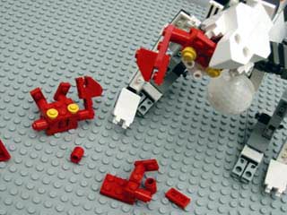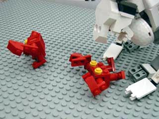 | 設定 敵戦車部隊「タラバ」に対抗して、地上人月面基地が協力して開発した、 カニ人類用駆逐ホバー戦車。 大型鉄鋼歩兵 数台による敵戦車への攻撃の後 高速で敵部隊に突入、格闘形態に変型。 敵兵士を捕獲後、機体前下部のグリル・ガンで焼殺! 砲塔部レーザートーチで切断! クラッシャーで甲殻を完全破砕する! ・・・という、月面基地史上まれにみる残虐、非人道的なマシン。 月での戦闘は、他勢力の思惑をも孕み、増々激化の道を辿ってゆくのであった! がんばれ、レゴ・ムーンベース!! まけるな、地上人!! 両生人類は、本当に人類の味方なのか??! 次回『激闘! 涙の海底人類大逆襲!』に御期待下さい!! |