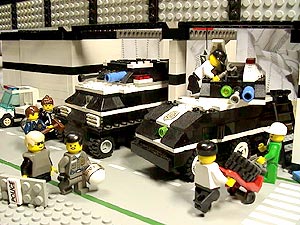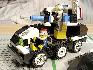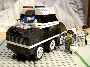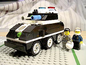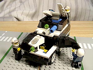 | 設定 以前ご紹介した04式特型防爆車の後継車として、この05式は開発された。 最大の改良点は幅が10ポッチから、6ポッチへとスリムになった点である。 04式の10ポッチ幅では、走行時に2車線をまたいでしまう為、運用面で大きな問題があったのだ。 新型の05式は、車幅が6ポッチに押さえてあるので、公道での走行も十分可能である。 また、小型化と機関部の改良の結果、走行性能も大幅に向上している。 装甲パトカーとして運用可能であり、04式のような大きな輸送トレーラーは不要である。 リンク 「警視庁特殊車両見学記2 05式特型防爆車編」 http://j-afv.hp.infoseek.co.jp/lego/drama/0005/0005-s-1.html |