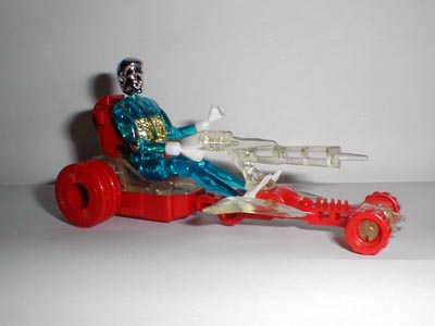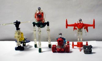 最初に発売されたミクロマン達はハダシのヤツ4体で、メカとの同梱包でした。 今でこそ彼らには名前が付いていますが当時の同封小雑誌では、 「ブルーブレストを装着したオレンジミクロマン」 などと書いてあります。 そう、この頃は個体による能力差(強いとか頭が良いとか)が無く、 単にミクロマンと呼ばれていてブレストの付け替えで 色々な超能力が使える事になっていました。 その後、違う形のミクロマンが出た時に名前と番号が与えられた様です。 実は今だに彼らを名前で区別する事が出来ません(^^; |