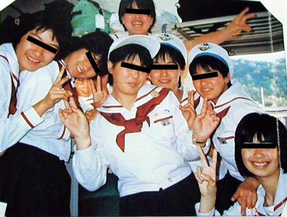 これは修学旅行の時に恐らく新幹線(あるいは在来線の特急)の中で撮影された写真 です。 で、どの辺が怪しいかといいますと、 向かって左から2番目の女の子の顔の下に、 ピ ンボケの顔が見えますでしょうか? この構図でこの顔のサイズでは、どう考えても空間的に距離がおかしいし、 顔以外の ものがそれっぽく写っているとも思えないのですが、いかがでしょうか? ちなみに、私がこの疑問を主張しても同級生の誰も賛同してくれませんでした(^^) まあ私もそんな安易に心霊写真を信じてるわけではありませんし、 おそらく偶然の角 度の問題か、現像ミスだろうとは思うんですけどね。 |