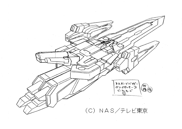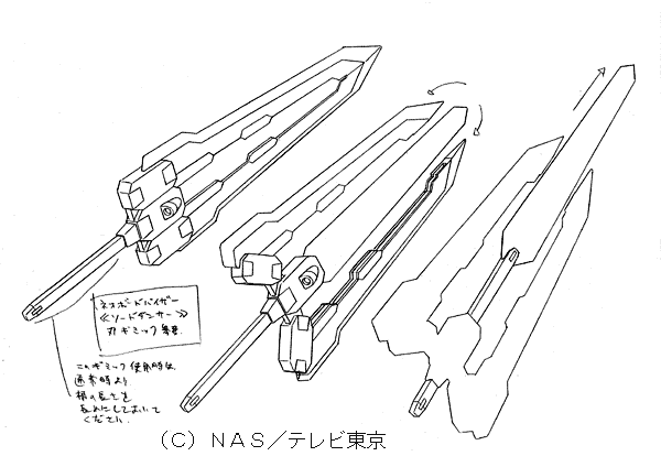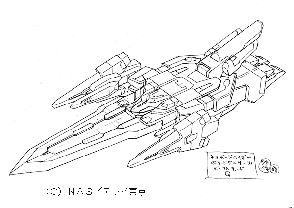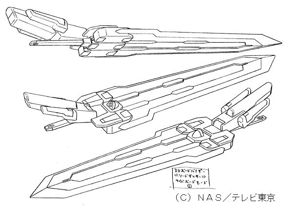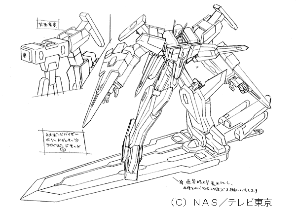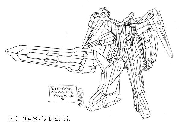 | 宮崎さんのコメント 最終主人公機体。 価格帯が上がったため、ここに至って、おおむね分離なしの変形が可能になりました。 特徴を持たせるために、巨大剣を持たせたのですが、 コレをデザインした時点で私は○ンダムアストレイ○ルーフレームセカンド(?)の存在をまったく知りませんでした。 デザイン送った直後に書店の模型誌で見て、本気でデザインし直そうかと思った位です。 …まあ、考える事はみんな似たり寄ったりなのね、という事で、納得して寝ました。 変化球なデザインが山盛りのアムドライバーなのですが、ここまでそれを続けたおかげで、 相対的に、『普通にカッコイイ路線』のこのデザインのキャラ立てが可能になりました。 『ヒーロー的カッコイイ』ものが山盛りあっても、飽きるだけで、キャラが食い合って死んでしまう との考えからですが、これがなかなか、理解してもらいにくいものです。 玩具主導なだけなら、全てヒーロースタイルでも(むしろその方が?)良いのかも知れせんが… |