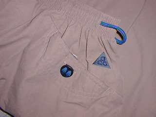 まずは、クライミングパンツです。パタゴニアでも同じような型が現行品でもあると思います。このACGクライミングパンツは、腰と裾を紐で縛るようになっています。いいでしょうこの色。シルエットもナイスです。買ったのは、4年くらい前かな。しかも、確かナイキジャパンの紙タグがついてたような気がします。それにもかかわらず、当時ACGのウェアなんて日本ではほとんど出回ってませんでした。本格的に日本でACGウェアが展開されるようになったのは、F.I.T.シリーズからですね。これを買ったのも、オッシュマンズとかの普通のスポーツ屋さんで買ったのではなく、渋谷のスラップショットです。スラップショット、偉いなー。当時からこういうのをセレクトしてたっていうのは。さすがはアメカジの大御所です。