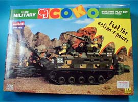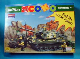 | またしてもLEGOの類似商品です。 今回のは COKO (たぶん ココ )というメーカーの物です。 湾岸戦争を題材にしたシリーズの様です。 又しても恵比寿の某所1Fで購入。 ブロックメンやメガブロックよりはガッチリ組めますが、 やはりLEGOの精度や組み方には及びません。 |