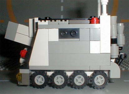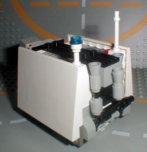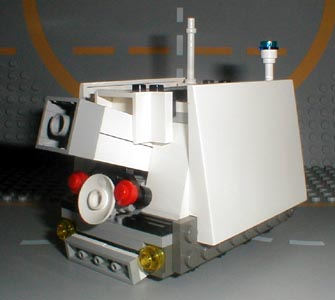 | 2000年一発目に購入したのが、サッカーレゴの救護班とTVクルー。 救護班に付いてた屋根2枚を縦にすると戦車のシュルツェン(サイドアーマー)に ならないかなーと思ったのがモデル制作のきっかけです。 ですから試作モデルはその2種を部品に使ったため、白色と青色で構成されていました。 サイドになんかマークが欲しい気も・・・ |